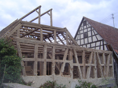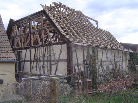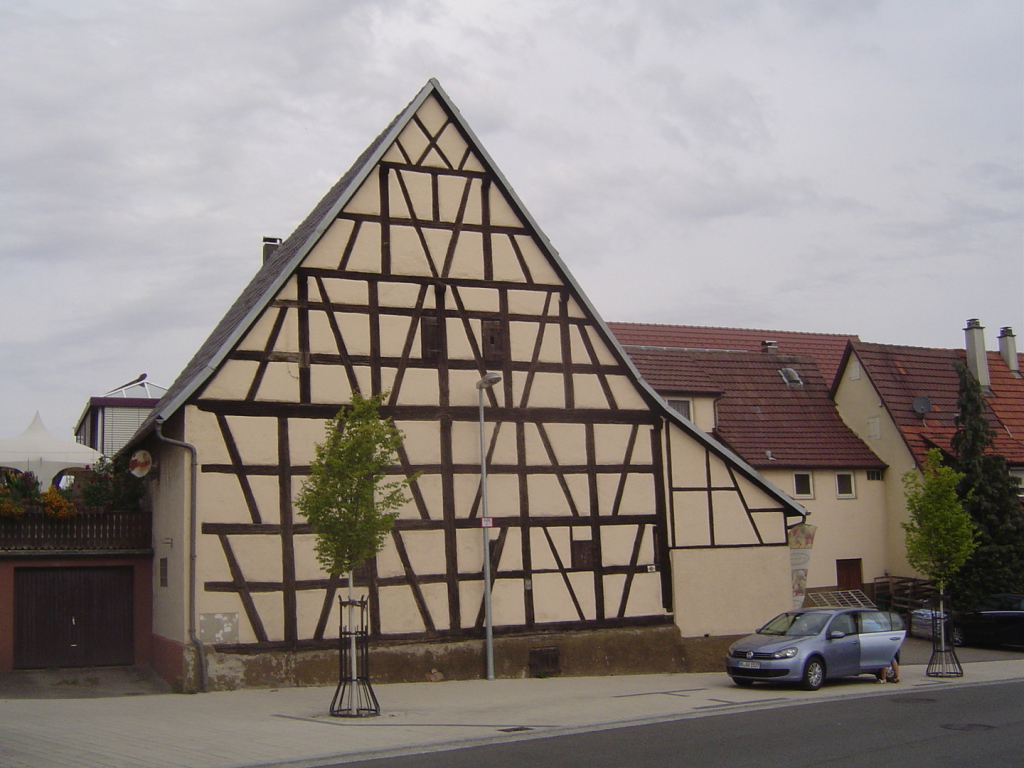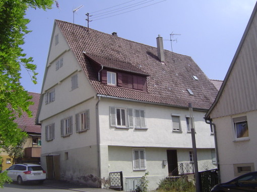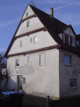 Auch wenn es vielleicht nicht mehr besonders erhaltenswert gewesen ist - es war eines der ältesten Malmsheimer Häuser. Dieser Tage (Mai 2015) ist auch das Haus Calwer Straße 13 abgerissen worden. Bereits im 1580 erstellten Lagerbuch des Amts Böblingen, den Flecken Malmsheim betreffend, ist das Haus "am Weilemer Thor" erwähnt, damals im Besitz von Althans Scheck. Das hohe Alter des Hauses war bis zuletzt noch auf der Ostseite des Hauses am altertümlichen Fachwerk mit seinen Geschoßvorstößen und großen Pfettenabständen (vgl. Abbildung) zu erkennen. Auf der Westseite war das Haus vor Jahrzehnten im Zuge des Ausbaus der Calwer/Renninger Straße verkürzt und neu aufgemauert worden.