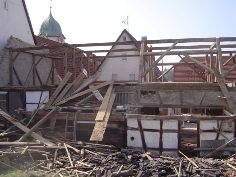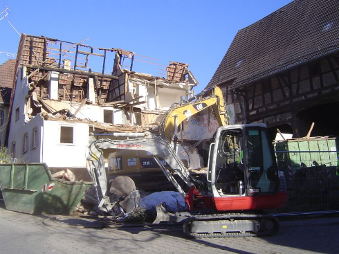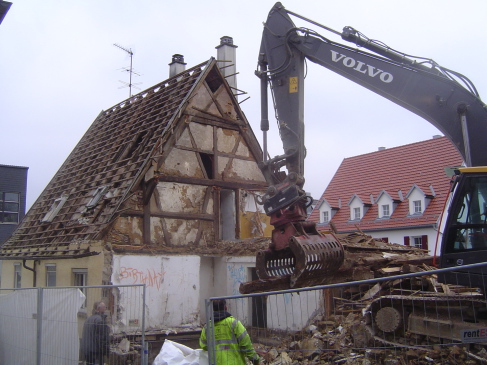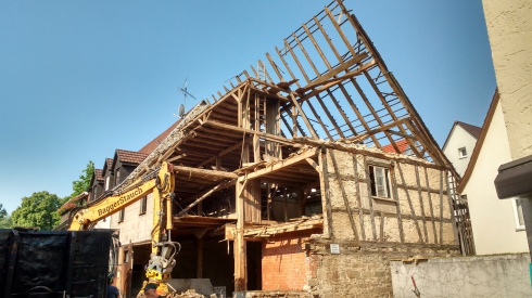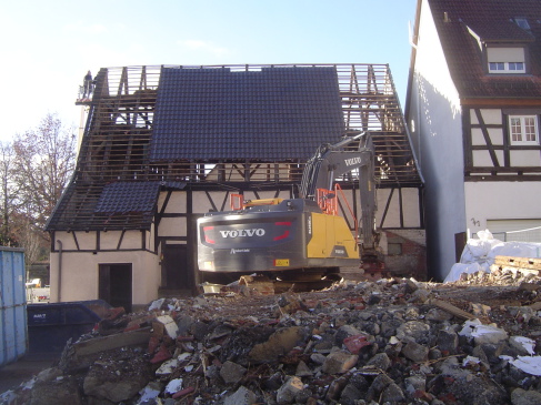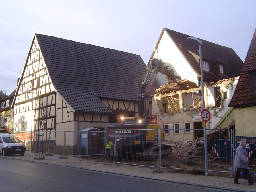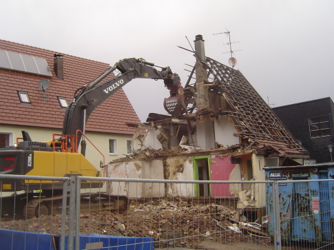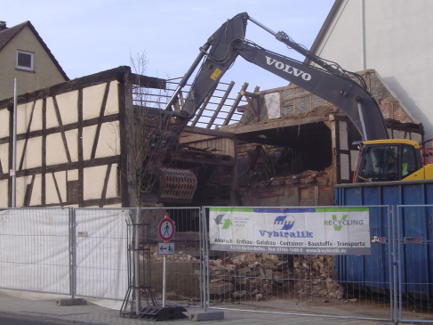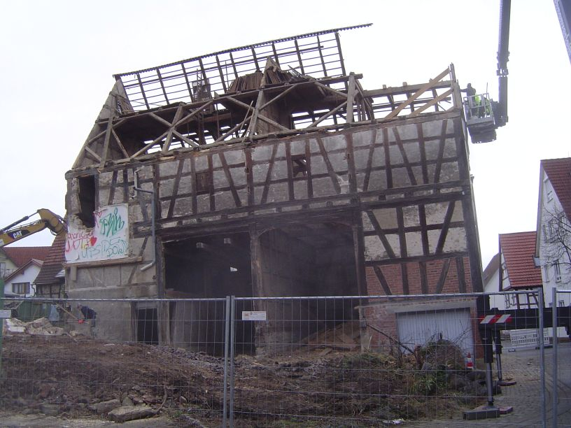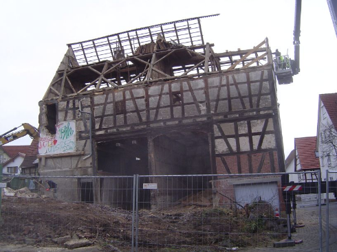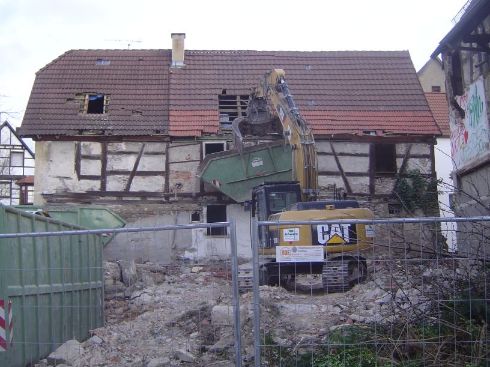 Mit zwei Schreiben vom 1. Juni 2017 und vom 9. Februar 2018 an die Stadtverwaltung hat sich der Heimatverein für den Erhalt der Anlage eingesetzt - wieder einmal vergeblich. Am 21. Februar 2018 hat der Ausschuss "Planen-Technik-Bauen" des Gemeinderats dem Abriss zunächst der Scheuer zugestimmt. Im April/Mai 2018 sind nun die stattliche Scheuer und das originelle Nebengebäude dem Erdboden gleich gemacht worden.