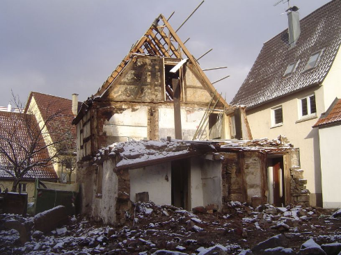 Hier soll ein Thema angesprochen werden, das innerhalb des Heimatvereins und in Teilen der Bevölkerung mit wachsender Sorge verfolgt wird: In den Ortskernen Renningens und Malmsheims ist festzustellen, dass im Rahmen von Sanierungen immer mehr ortsbildprägende alte Bausubstanz abgerissen wird und für immer verschwindet. Das gilt sowohl für eine Reihe zurück-liegender Fälle aus jüngerer Zeit als auch für momentan noch in Planung befindliche Maßnahmen. Diese Entwicklung wird sich auch in Zukunft fortsetzen, offensichtlich wird sie auch durch eine gute Wirtschaftslage begünstigt. Auch die außerordentlich niederen Anlagezinsen und die günstigen Darlehenszinsen führen dazu, dass vermehrt in den Neubau von Immobilien investiert wird. Bei der vorhandenen Bauflächenknappheit ist auch ein enormer Druck auf "Abbruchgebäude" in historischen Ortskernen entstanden.