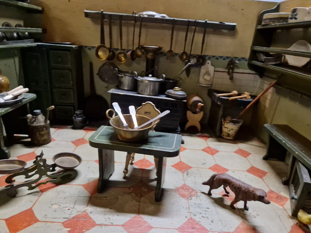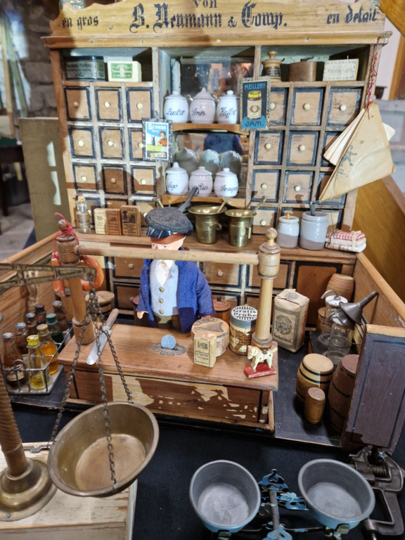 Im ersten Stock sind eine Vielzahl von Puppenstuben, Puppenschulen, Puppenküchen und Kaufläden ausgestellt und zeigen über was sich die Kinder freuten.